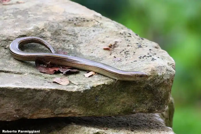 Издалека отличить его от безногих нереально. Все тело покрыто отливающей металлом чешуёй, клиновидная голова сидит на толстой шее, а тулово плавно переходит в длинный хвост. Создаётся стойкое ощущение, что перед тобой не ящерица, а что-то типа ужа, длиной в 40-45 сантиметров. Обитает халцид тоже в типичных для змей локациях. Животины облюбовали берега ручьёв и рек, заливные луга и болота от Италии до Северной Африки. На этих территориях так много настоящих змей, что затеряться в их толпе можно без труда.