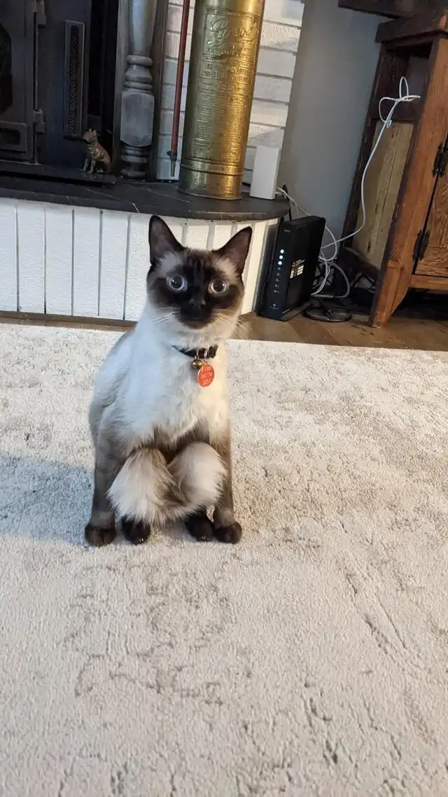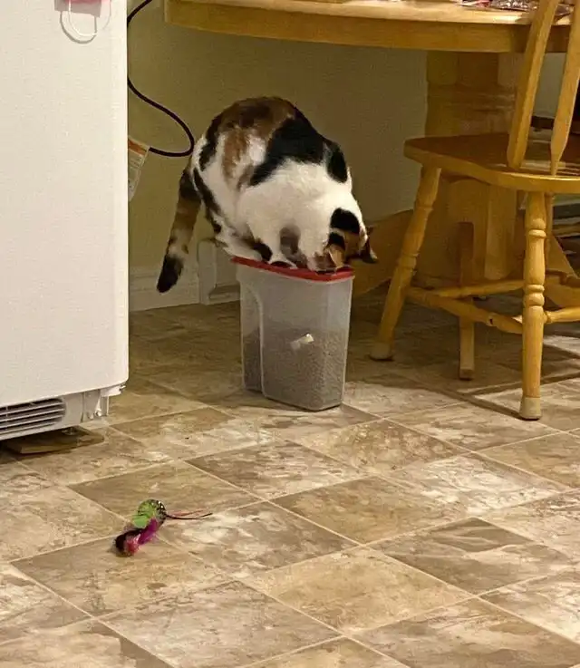 У неё полная миска, но она всё равно пытается добраться до всего корма