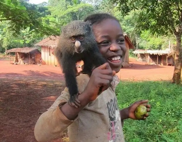 Посередине не ребёнок. Это малая белоносая мартышка. Они часто тусуются вместе с нашими героями и даже способны давать совместное потомство.