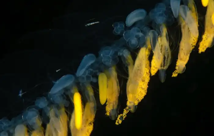 Но самые ценные участники колонии — гастрозоиды. Эти персонажи составляют значительную долю населения. Они еду не только кушают, но и добывают. А ещё, именно гастрозоиды превращают сифонофору в подводную гирлянду, ведь они умеют светиться! Так примитивные создания приманивают не менее примитивную добычу. А дальше дело техники — щупальцами со стрекательными клетками гастрозоиды захватывают добычу и отправляют её в рот, прямо как медуза.
