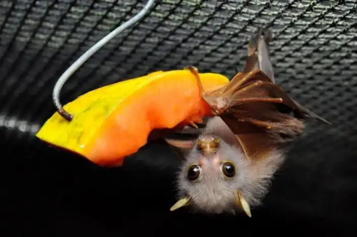 В еде животины непривередливы, они с удовольствием уплетают любые фрукты, которые найдут в джунглях. Крыланы знают, что тучи не будут на небе вечно, поэтому трескают так, что за ушами на ультразвуке трещит. Набив пузико, летучий мышь старается утащить с собой добавку. Грузоподъемность зверька — 25 граммов, половина собственного веса!