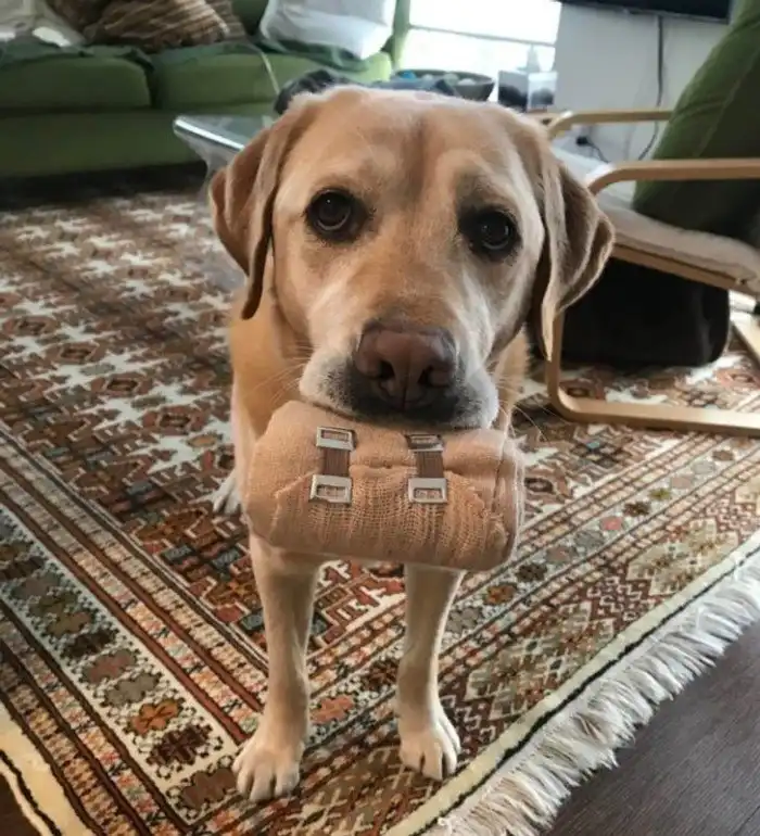 Пока я делал упражнения для восстановления лодыжки, пёс принёс мой бинт