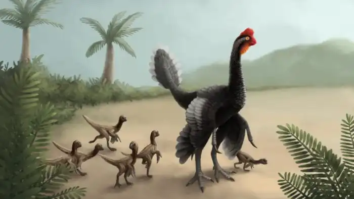 Ну а где степи — там жаркое лето и морозные зимы. 75 миллионов лет назад климат был заметно мягче нынешнего, но животине всё же пришлось обзавестись плотным перьевым покровом. Пока обычные динозавры таскали простенькие перья, больше напоминающие волосы, наш герой щеголял шикарными опахалами, как у настоящих птиц!