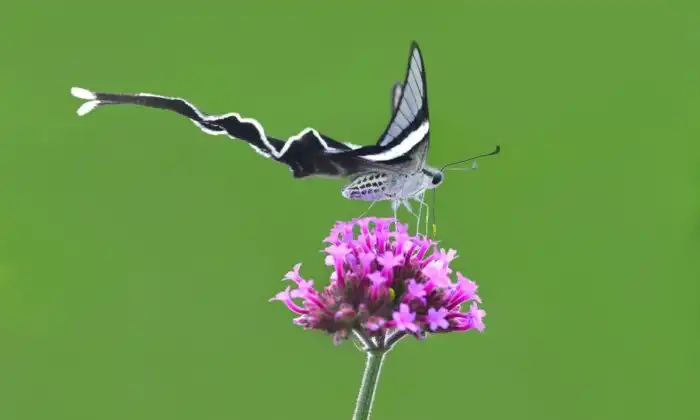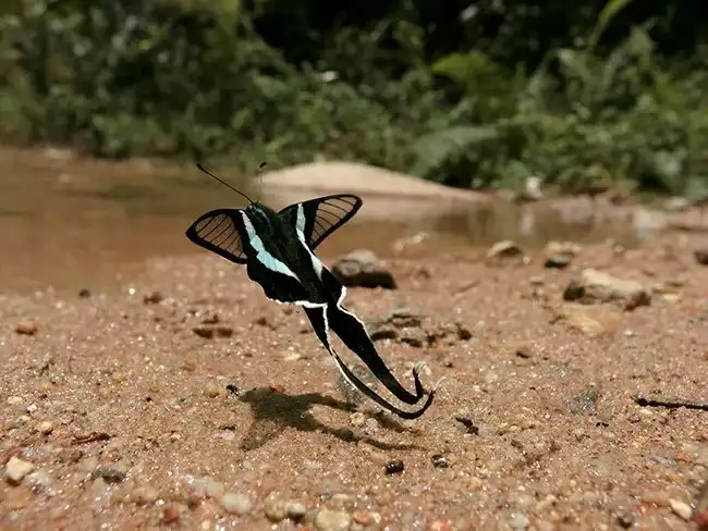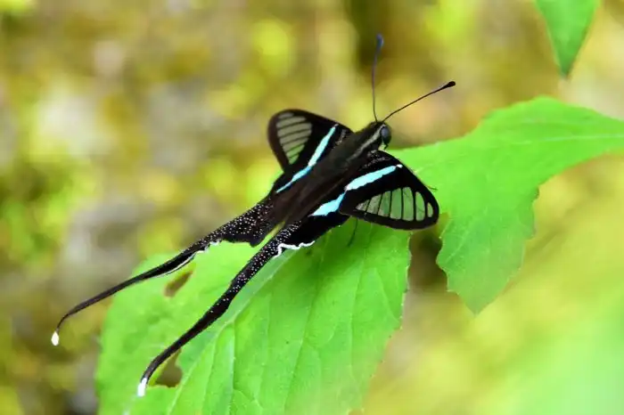 Пока бабочка драконий хвост сидит, чем-то примечательным она вам не покажется. Размером драконий хвост, что наша капустница с огорода, — размах крыльев не больше 5 сантиметров. Окрас, по меркам бабочек, тоже скромный: чёрные крылья с прозрачными и бирюзовыми вставками — мир чешуйчатокрылых видал и более изобретательные расцветки. Но стоит букахе взлететь, и вы поймете, что не видели таких бабочек никогда!
