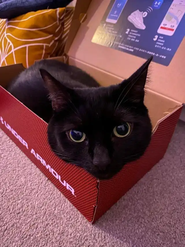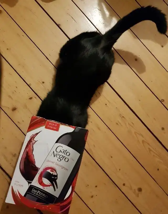 Чёрный кот в коробке из-под вина «Чёрный кот»