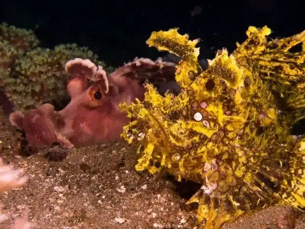 Две примерно равных по силе особи могут какое-то время жить рядом. Пока одна из них не ослабнет. В данном случае наш герой сидит с рыбой-скорпионом из другого вида.