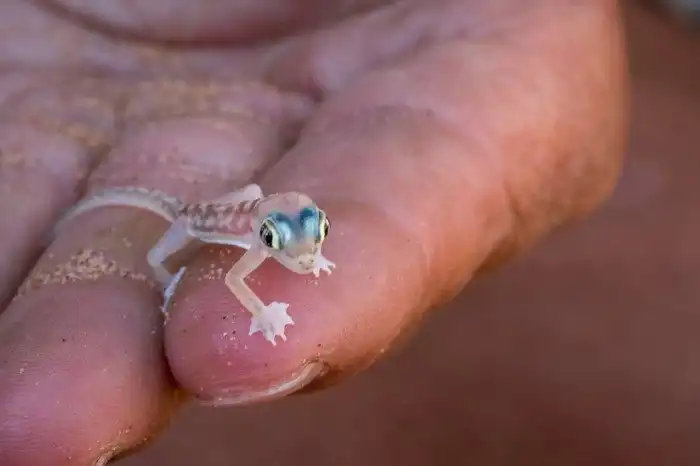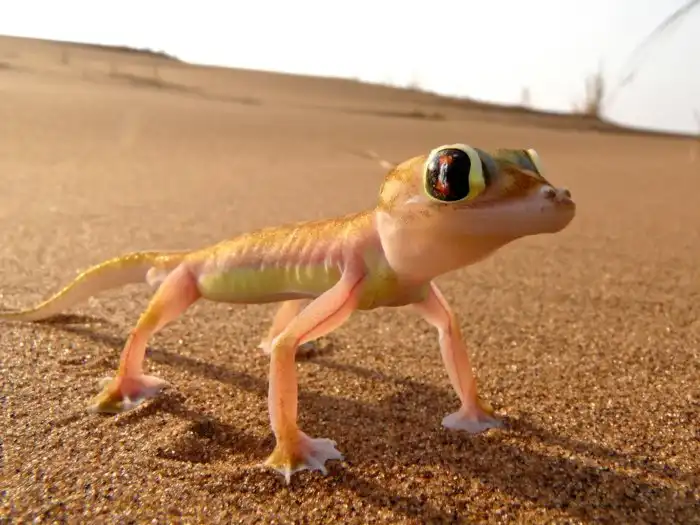 Перепонки между пальцами помогают геккону с легкостью бегать по раскаленному и рыхлому песку, что делает его самым быстрым и проворным пацаном на районе. А ещё, такие широкие лапки автоматически превращаются в копалки — очень удобно, если нужно по быстрому вырыть нору.
