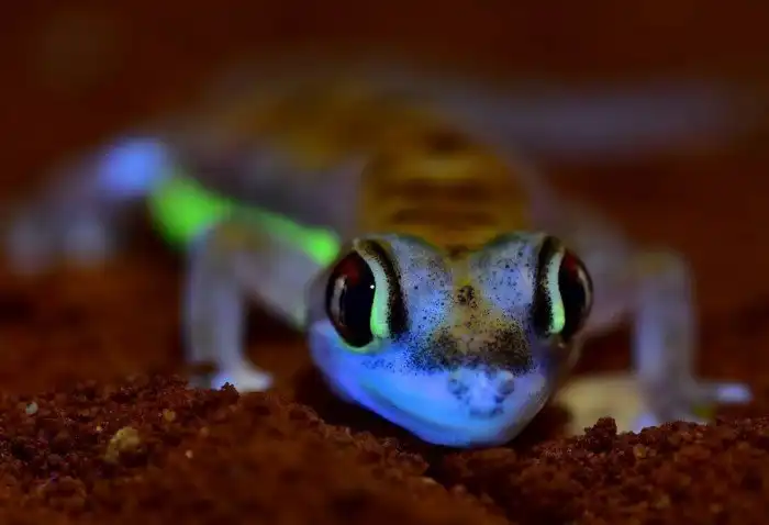 Эти особенные клетки похожи на те, что помогают хамелеонам менять цвет, но их способность светиться при ультрафиолете обнаружена впервые. Причем светятся они так сильно, что по яркости намибийские гекконы удерживают уверенное первое место среди всех позвоночных животных.