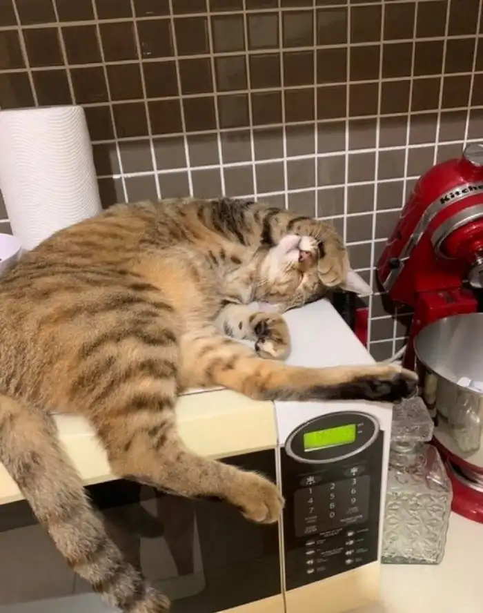 Этому полосатику тоже запрещено лазить по столам, но про микроволновую печь никто ничего не говорил. Вредные излучения? Нет, не слышали!