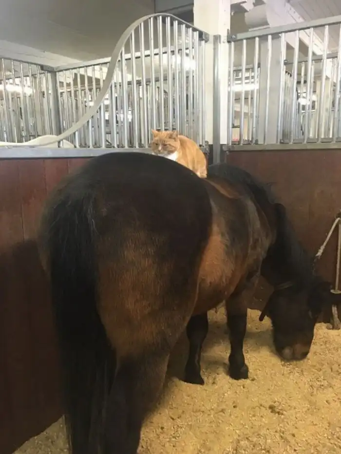 Каждая собака знает, что самое удобное место для отдыха — это хозяйский диван. Но у котов свое мнение на этот счет, и порой они устраиваются в самых неудобных и неподходящих местах, например, на дорожных указателях, турникетах или на живой лошади.