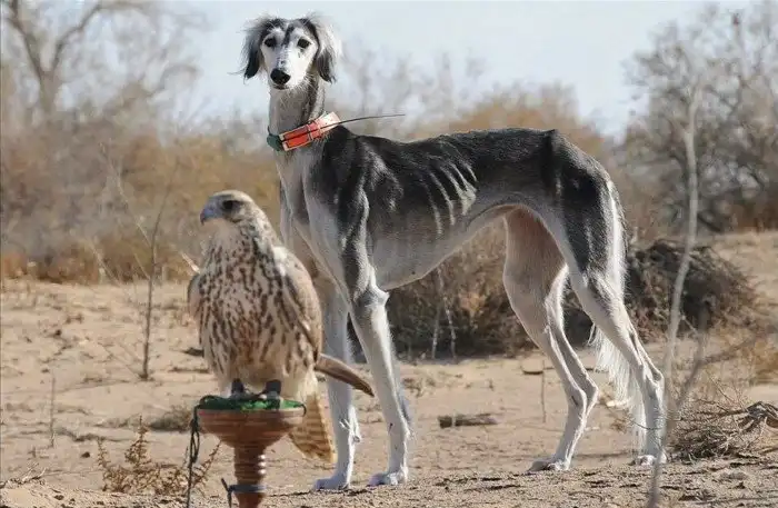 Ещё одна уникальная особенность тазы в том, что она может охотиться в паре с беркутом или соколом. Щенков и птенцов кормят, обучают и содержат вместе.