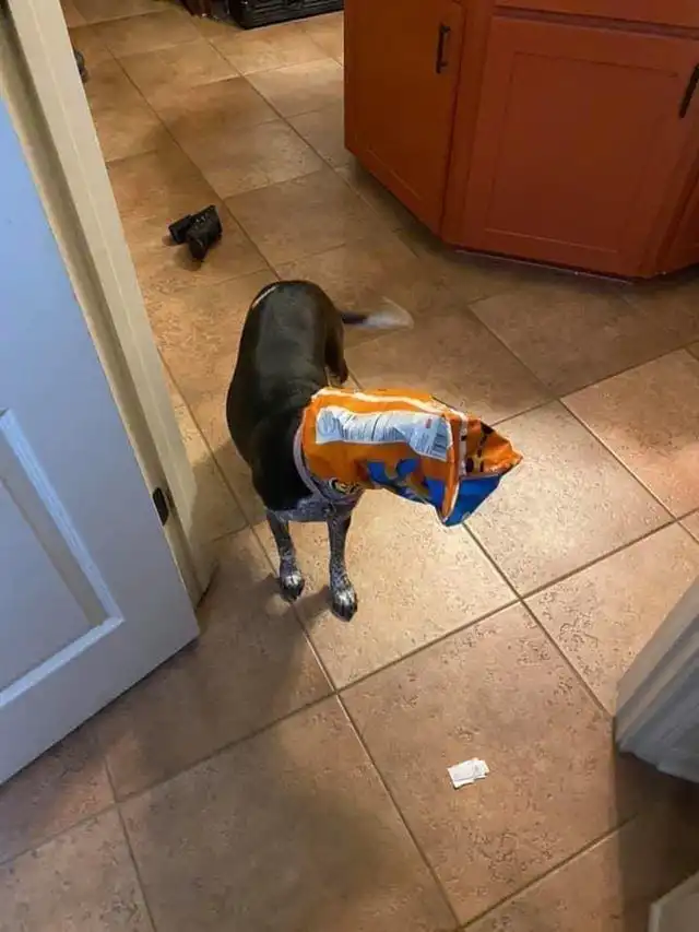 Она ничего не съела, просто залезла в помойку и засунула голову в пакет.