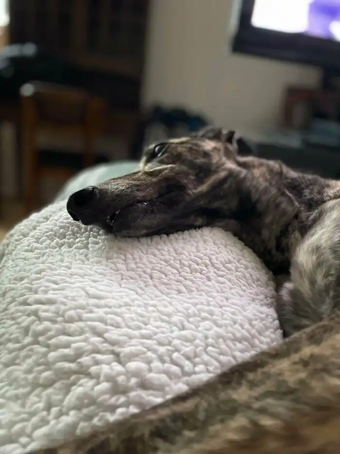 "Тива - борзая, которая участвовала в 150 гонках, бегая на большой скорости. Теперь она на пенсии, и наслаждается заслуженным отдыхом в нашей семье"