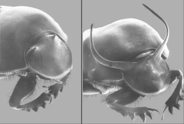 Небольшой безрогий, но очень наглый самец появился из ниоткуда, полюбил самку и быстро исчез в никуда! У парней такого типа нет и шанса в схватке со своими рогатыми собратьями, поэтому свой род они продолжают не силой, но хитростью. Почему самки терпят такое непотребство? Потому что перчик у таких самцов, что надо. По сравнению с более сильными жуками-быками половые железы безрогих парней куда крупнее среднестатистических.
