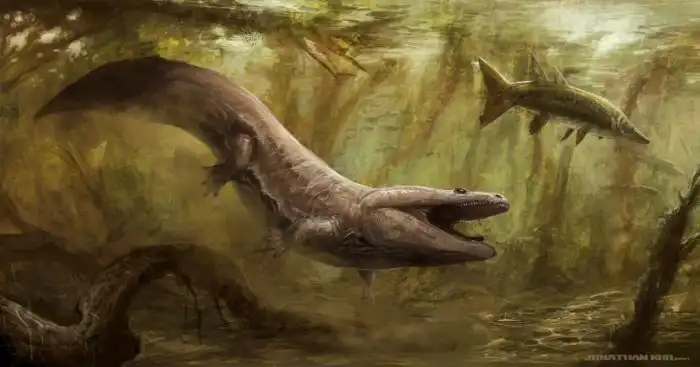 Его черепушка в форме седалища унитаза (ее так первооткрыватель описал, без шуток) занимала примерно пятую часть от массивного тела. А ведь животина была не из мелких: тритон-переросток вырастал почти до параметров автомобиля: 3 метра в длину, полтонны веса. Ну а что, на дворе было начало триасового периода — век царствования амфибий.