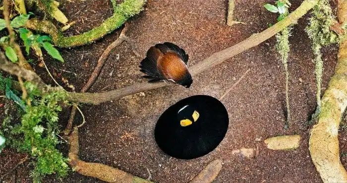 Итак, урок от западной паротии по завоеванию самочек. Первым делом нужно как следует прибраться перед приходом дамы. Парень расчищает танцевальную площадку от листочков, веточек и прочего мусора, чтобы ничего не отвлекало самку от представления.