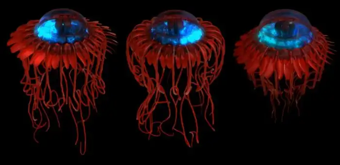 Называется эта животина коронная медуза. Встретить хитрож... хитрое создание можно практически по всему миру, но на очень большой глубине — от 700 до 5000 метров. По глубоководным меркам наша героиня просто микроскопическая — ее ярко-красный купол редко вырастает больше 20 сантиметров в диаметре. Такую мелочь не спасут даже стрекательные клетки на нескольких десятках щупалец. Легкая добыча, на первый взгляд. Но только на первый.