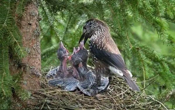 Спустя 2.5 недели насиживания, беспомощные детки вылупятся и будут просить кушать. Агушу в лесах не продают, поэтому кедровки кормят малышей сначала размоченными в зобу орешками, а затем переводят молодняк на белковую пищу: насекомых, мелких птиц и грызунов. Самостоятельными птенцы станут к началу июня, но снабжать их вкусняшками родители будут ещё пару месяцев.