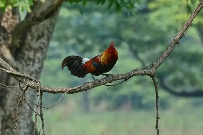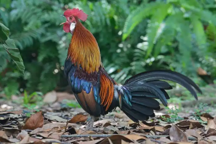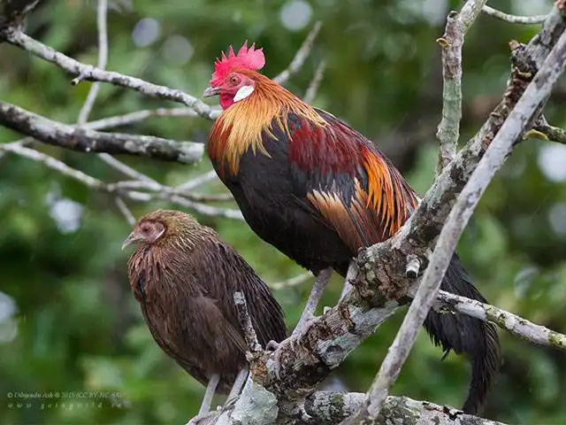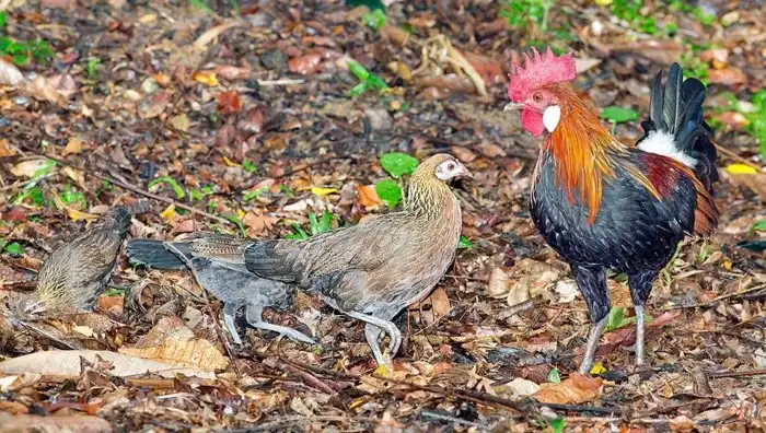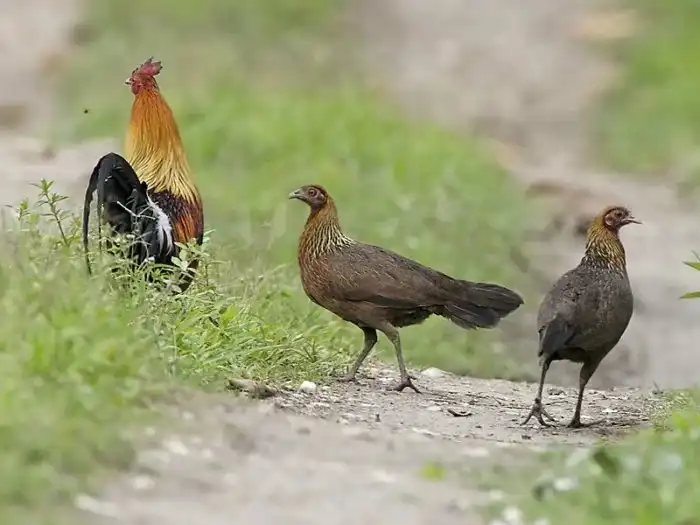 С виду джунглевые куры выглядят среднестатистическими деревенскими кукареками на минималках — серо коричневые самки и нарядные яркие петухи. В отличие от бройлеров, эти ребята не набирают выше 1250 грамм веса. И это самцы, дамы ещё миниатюрнее — их максимум 1 кило. Зато пернатые тушки имеют хорошо развитую мускулатуру, что помогает им вполне сносно летать, — пернатые даже ночуют на деревьях.