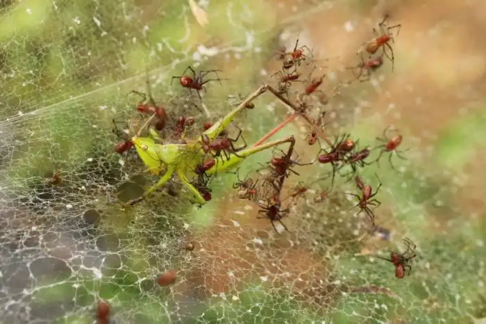 В отличие от муравьёв, паукообразные не делят друг друга на касты: самцы и самки вместе строят и ремонтируют паутину, сообща охотятся и делят добычу. Короче, социалистический рай для этих товарищей стал реальностью. И эта стратегия полностью себя оправдывает. Благодаря ей пауки способны охотиться на добычу в десятки, а то и сотни раз больше себя.