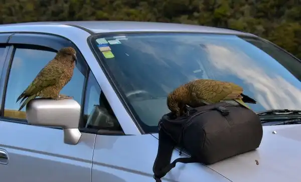 Попугаи кеа — пернатые хулиганы и воришки, отличающиеся невероятным умом. Открытые окна автомобилей и багажник становятся для них лёгким источником пищи и не только. Они забирают любые неосторожно брошенные вещи, которые можно спрятать в расщелинах скал и между камнями.