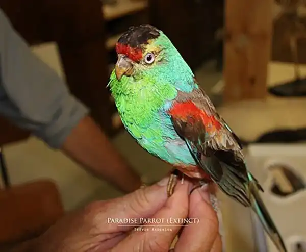 Жили птицы в травянистых лесах на юге материка. Размерами райские попуги не отличались: примерно 30 сантиметров в длину да 100 грамм веса — чуть крупнее обычных волнистых. Зато могли похвастать красивейшим оперением, ставшим одной из причин их скоропостижной гибели. Наряд птах сочетал в себе бирюзовый, зелёный, красный, коричневый и чёрный цвета, что даже для попугаев считается роскошью.
