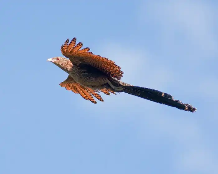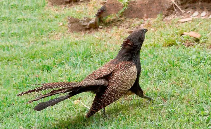 Начнём с того, что на кукушку фазанья кукушка не похожа. Биологи очень точно определили её сходство с фазанами. Наша героиня — самый крупный представитель семейства на континенте. Несмотря на то, что летать она умеет, предпочитает держаться поближе к земле — кормиться, плодиться, передвигаться там же.