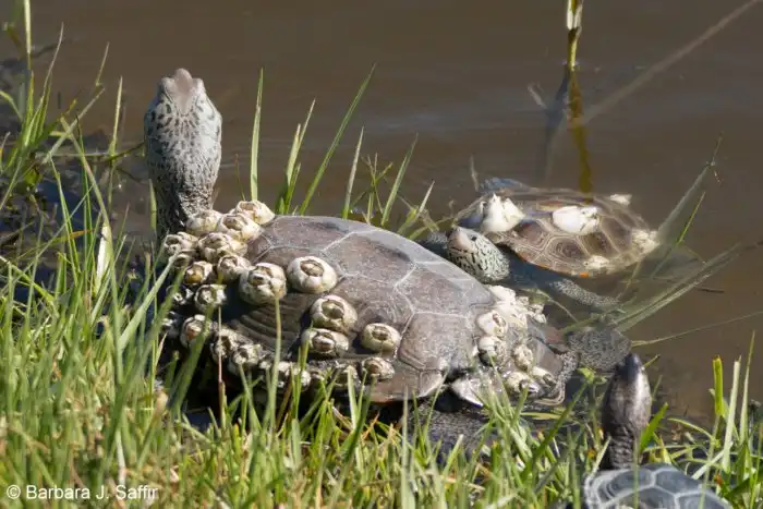 Моллюски для черепах могут стать не только едой, но и угрозой. Вот, например, морские уточки, очень сильно портят гидродинамику небольшой черепашки. А сделать с ними наша героиня ничего не может.