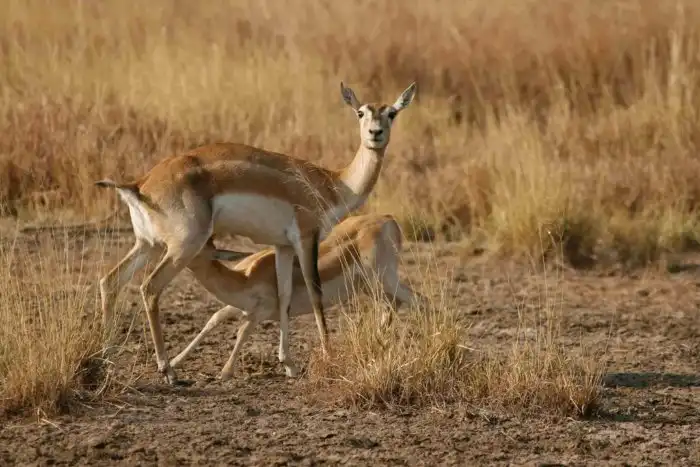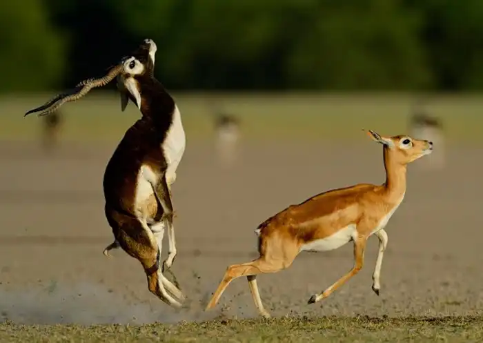Чтобы предупредить друг друга об опасности, одна из гарн, которая стоит на шухере, высоко прыгает. После чего все антилопы стада срываются с места.