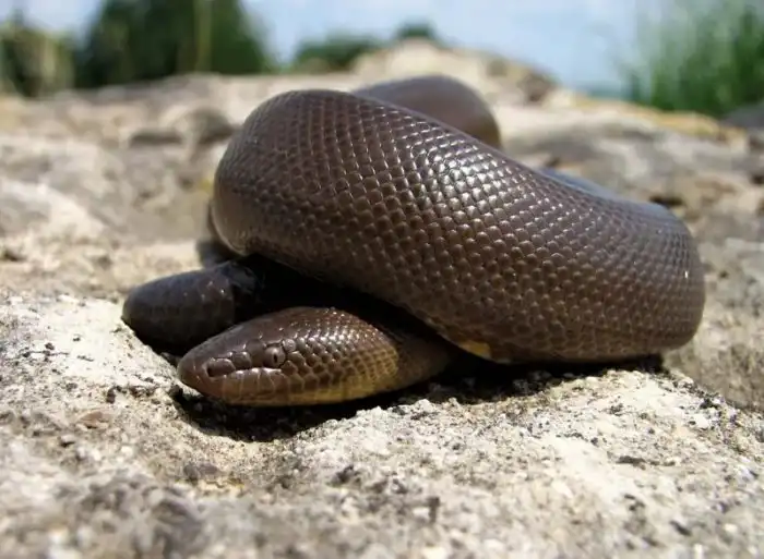 Резиновая змея, он же резиновый удав — один из самых мелких удавов. Если остальные его родичи растягиваются до размеров огородного шланга — 4-5 метров, то максимум нашего героя — 80 сантиметров. Такой даже до одной грядки не дотянется.