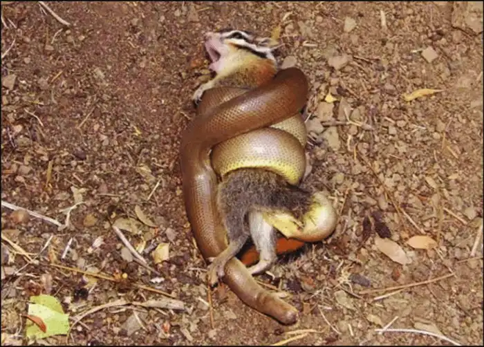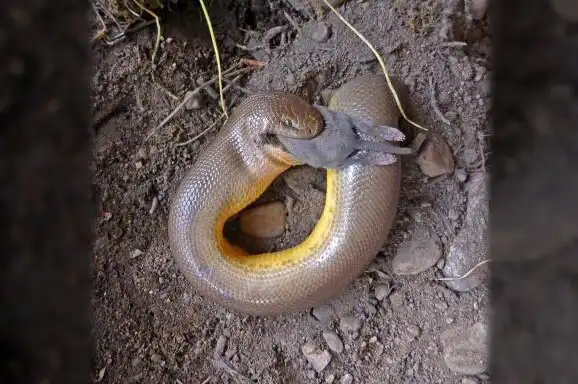 Но не стоит жалеть резинового змея. Ведь со своей добычей он тоже не особо церемонится. В его рацион входит всё, что меньше его: ящерицы, птенцы, яйца и даже другие змеи. Но основу составляют грызуны. Всех своих жертв змей берёт на удушающий — классический приём удавов. Но на этом охотничьи хитрости нашего героя не заканчиваются. В охоте он тоже применяет головозад в свою пользу.