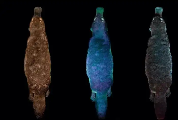 Оказывается, что под ультрафиолетом светятся не только скорпионы. Такой же способностью обладают и утконосы, приобретающие сине-зелёный оттенок.