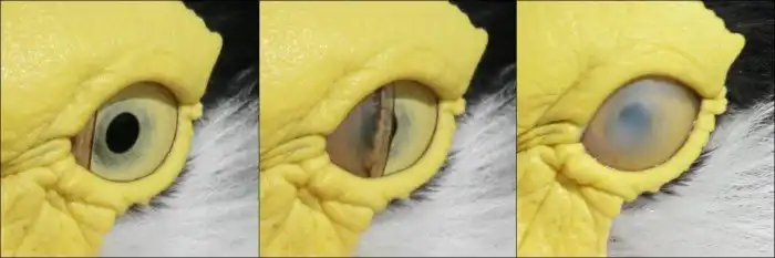 Это не болезнь и не мутация, птица просто… моргнула. Практически у всех пернатых есть особая мигательная перепонка, она же третье веко. Такая, кстати, есть у вас, просто она деградировала и превратилась в полулунную складку.