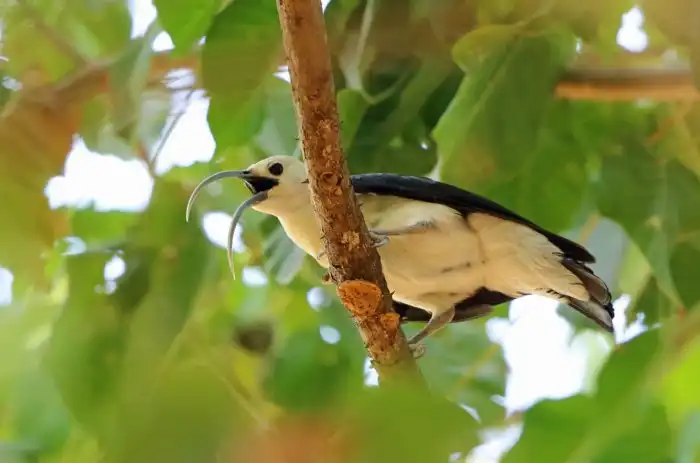 Предсказывать будущее серпоклювая ванга не умеет, но для мелкой живности она точно вестник неприятностей. Ведь одними древесными вредителями её рацион не ограничивается. Серпом-клювом птица пожинает жизни червей, тараканов, сверчков и даже рептилий. К тому же хрустеть мелкими животными птички предпочитают в большой компании из 30-50 пернатых друзей.