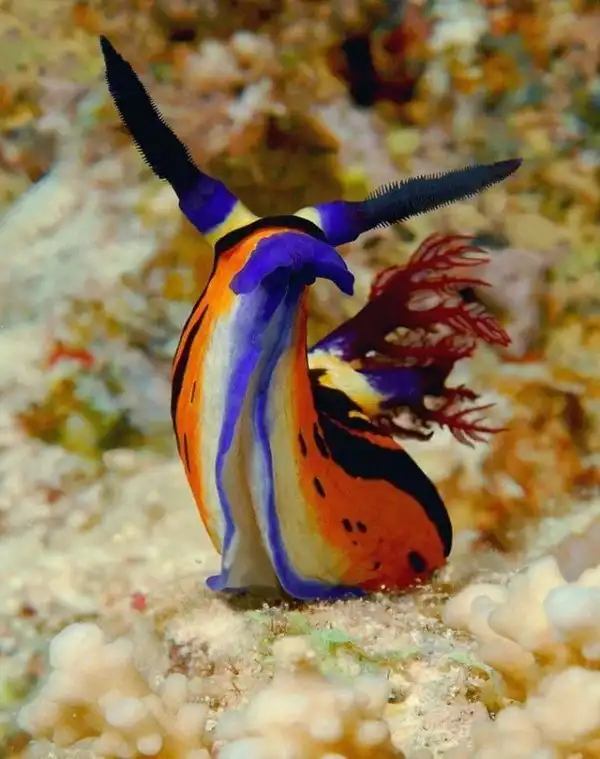 Отличительная особенность этого вида моллюсков — крупные оранжевые «рожки», которые называются ринофоры.