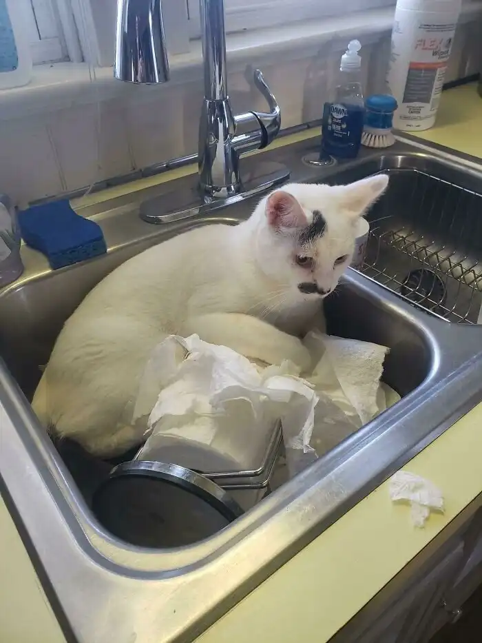 "Этот кот живёт у нас в офисе. Он постоянно находится в раковине. Мы даже обращались к ветеринару по этому вопросу, но он сказал, что кот делает так, "потому что он кот"
