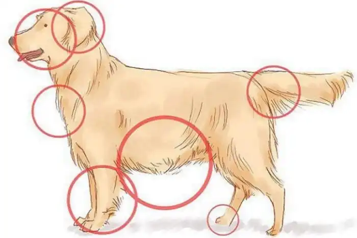 Клещи обожают места с большим количеством кровеносных сосудов. На картинке обозначено, какие места у собак для паразитов самые любимые.