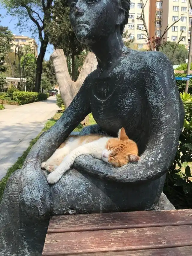 Но иногда их выбор, где бы на этот раз свернуться калачиком, падает на очень непредсказуемые места. К примеру, этими излюбленными остановками нередко оказываются статуи, где котики любят устроиться по комфортнее на руках каменной леди и сладко заснуть, тем самым став главным украшением этой скульптуры.