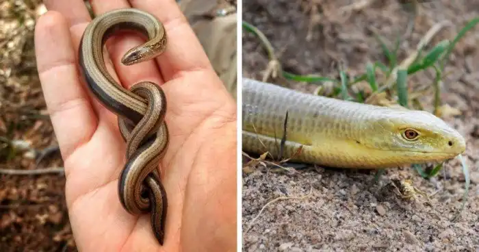 Глядя на безногую ящерицу, можно подумать, что это одна из разновидностей змей. Однако это не так. От змей она отличается наличием подвижных век, особого плечевого пояса. К тому же животное имеет совсем другое строение челюстей.
