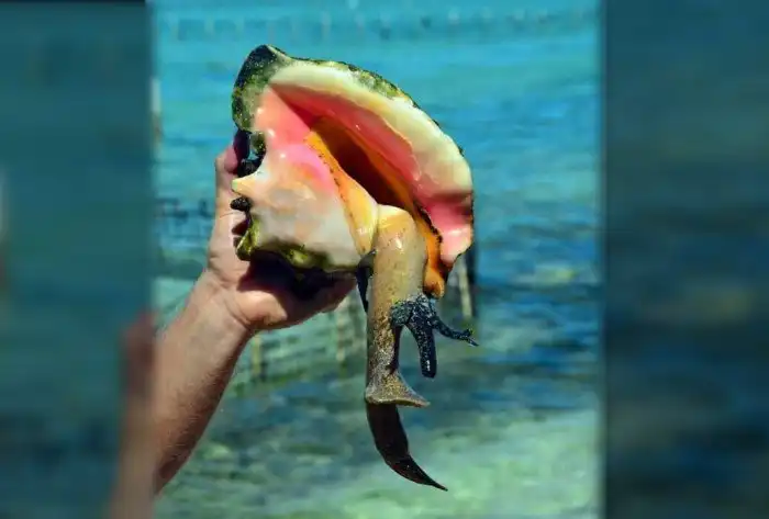 Эта улитка прописалась на солнечной Кубе и во всём Карибском бассейне. На её плечах красуется однокомнатный пентхаус из карбоната — грубоватого и золотистого снаружи и гладкого розового внутри. Размеры у моллюска поистине королевские — улитка достигает 35 см в длину и считается одним из крупнейших видов в своём семействе.