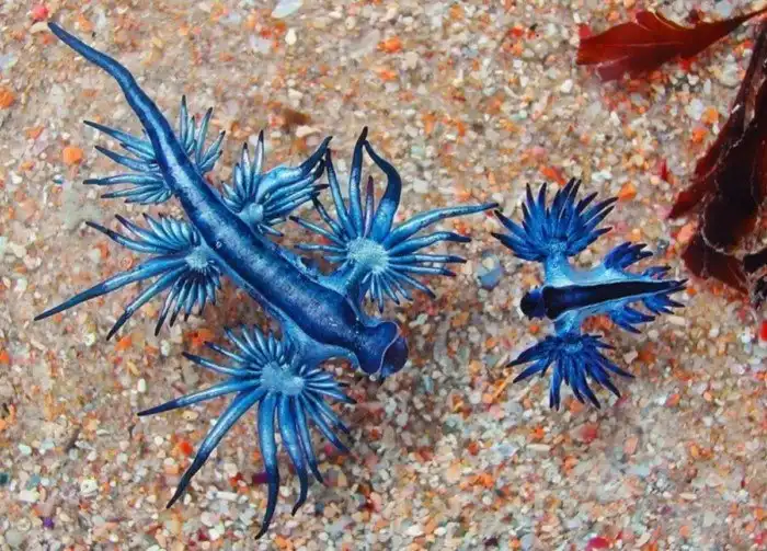 Голубой дракон плавает синим пузом к верху, из-за чего хищники его не замечают. А сам он питается медузами, причем обязательно ядовитыми, ведь этим ядом он потом защищается.