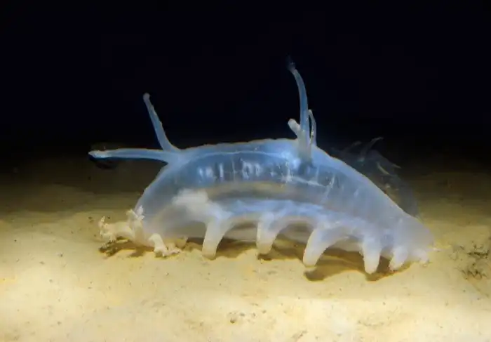 Морской огурец - скотопланес не любит жить в одиночестве, поэтому заводит себе в качестве домашних животных крабиков, с которыми, будто с собачками, ходит по дну океана, собирая еду.