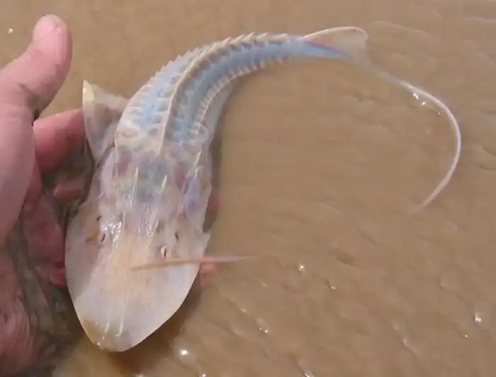 Но есть у амударьинского лжелопатоноса ещё одна примечательная черта, помимо морды лица — это его хвост. Среди всех осетровых лишь у этого вида есть длинная хвостовая нить. Её длина может быть чуть ли не размером с саму рыбу! Этот отросток стелется по воде и определяет колебания. Пятой точкой лжелопатонос ощущает всех тех, кто пытается незаметно подкрасться к нему сзади. Очень удобно, когда хочешь вовремя свинтить от хищника. Или того, кто хочет тебя поймать с целью завести ребёнка.