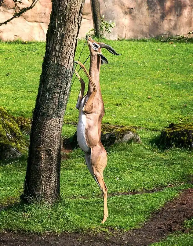 У этой антилопы особое устройство позвоночника и животное способно устойчиво стоять на двух ногах. Стоя на двух ногах и вытягивая шею геренук может есть листья на деревьях. Сустав у бедра шарнирный, что тоже облегчает двуногую трапезу. Животное опирается на ствол дерева, и так и стоит, объедая листья.