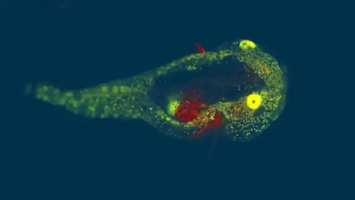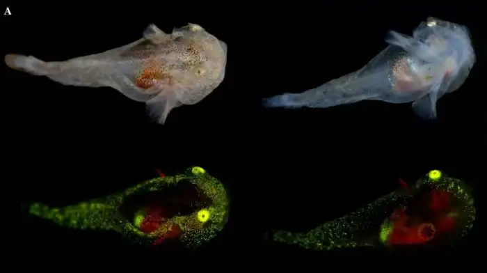 Мальки пестролистного слизня. Отчётливо видны зелёные точечные скопления соединений по всему телу и красное свечение брюха и грудных плавников.
