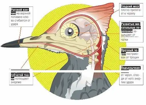 Во-первых, череп у дятла весьма невелик. Если бы он был крупнее, то сотрясение мозга было бы гарантировано. Ученые выдвинули также гипотезу, что дятлы оберегают себя, долбя не слишком быстро и только податливую древесину. По их мнению, участок губчатой кости при этом призван обеспечить структурную эластичность, снижающую вероятность образования трещин при ударах.