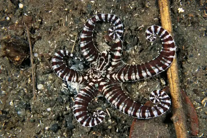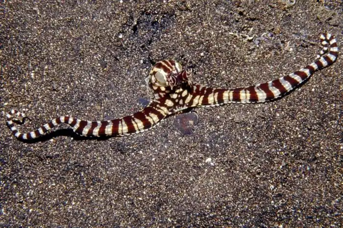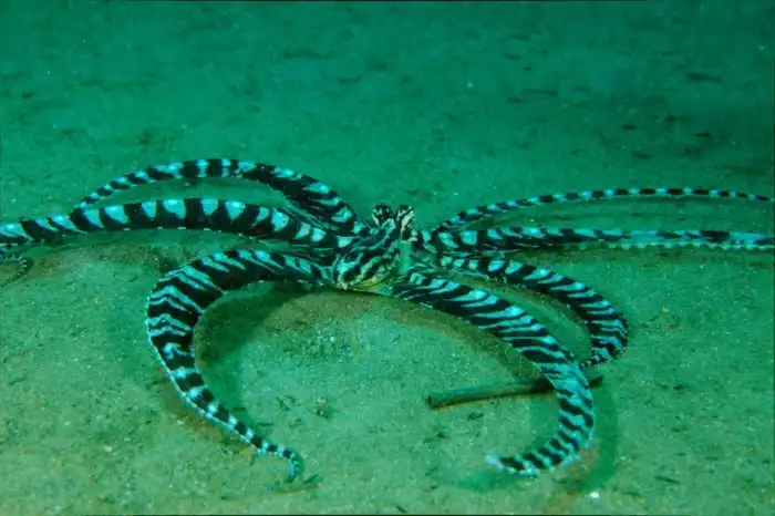 Конечно, человек сразу сообразит в чем подвох, но дурить морских хищников у моллюска получается феноменально. Следите за руками: если головоногий подберёт под себя все щупальца, кроме двух, вытянет оставленные конечности в стороны и перекрасит их в черно-белую полоску, то таким нехитрым образом осьминог превращается в морскую змею, лежащую на дне.