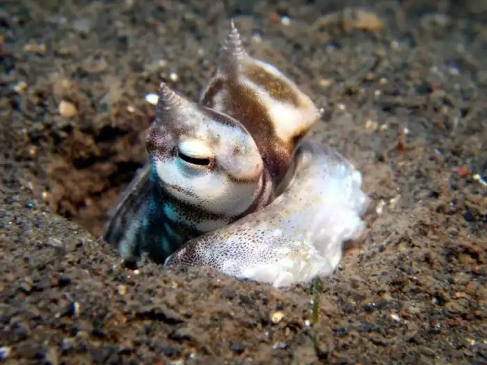 На мелководье же от мясоедов его спасает маскировка. Совсем ничего не делая, осьминог уже магически неприметен, ведь его основной цвет сливается с песком. Казалось бы, на этом можно остановиться, но моллюск решил по-другому и научился имитировать сразу нескольких животин.