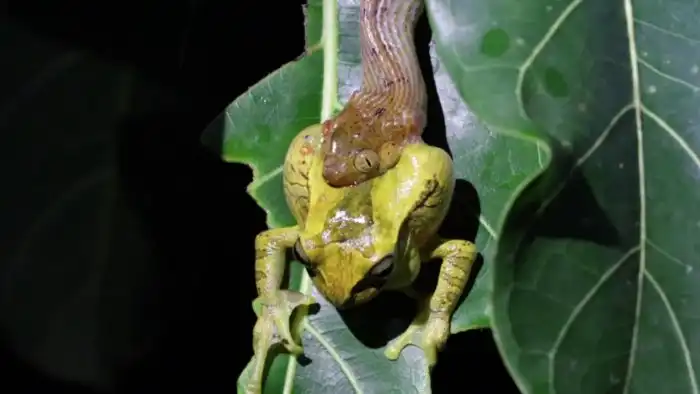 Глазища — главное оружие ремневидной змеи. А ящерицы — её главная добыча. Так как яда у рептилии нема, ремешок действует в крысу. На охоту наша героиня выползает в кромешную темень, когда все нормальные животные спят. Завидев закимарившую ящерку, змея бросается в атаку. Пока сонная рептилия очухается, она уже окажется в желудке. Наверное, юным ящеркам рассказывают страшные сказки не про злого серого волка, а про злую ремневидную змею. И я даже не знаю, что более жутко.