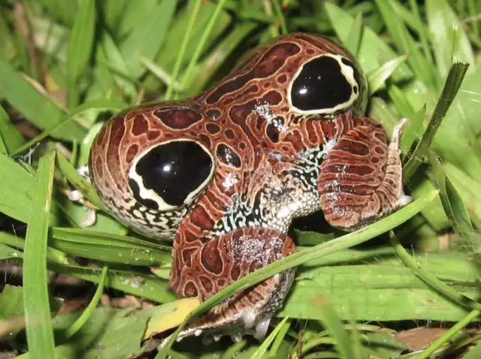 А эта лягушка куяба отпугивает хищников огромными ложными глазами, при приближении которого она выделяет неприятную слизь.